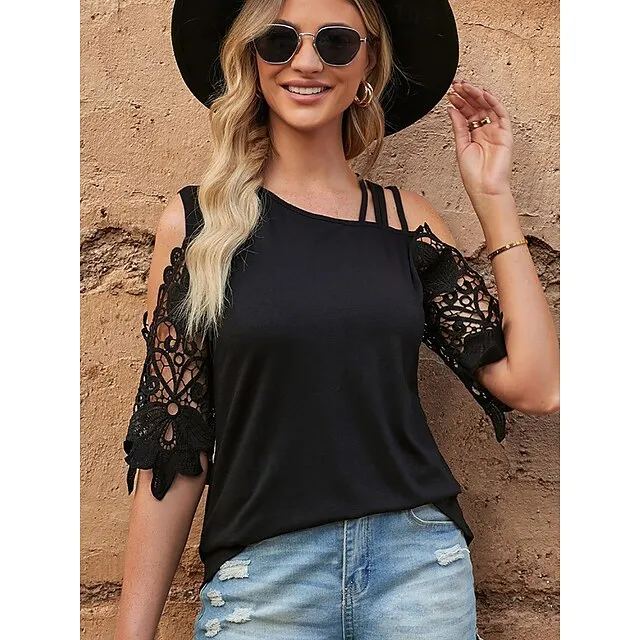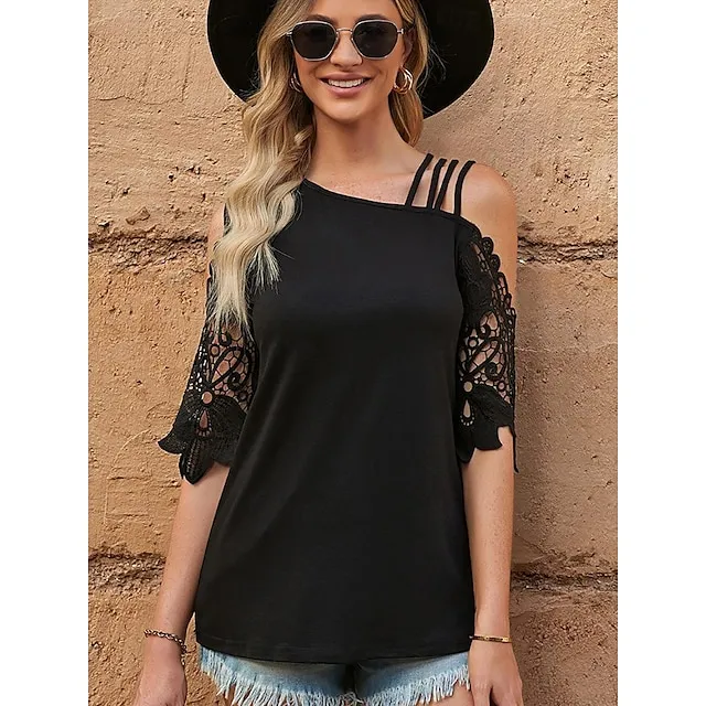Shirt Blouse Women’s Black Solid Color Lace Cut Out Street Daily Fashion One Shoulder S