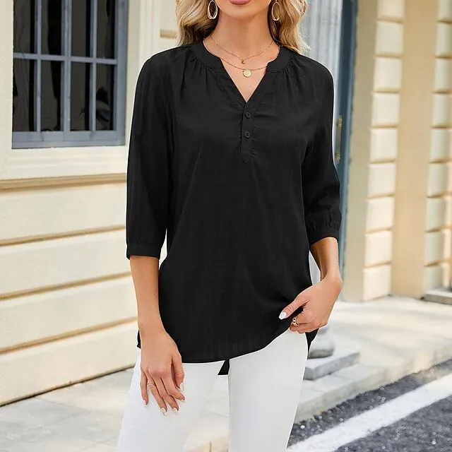 Women’s Shirt Blouse Marron Black White Plain Zipper 3/4 Length Sleeve Casual V Neck Regular S