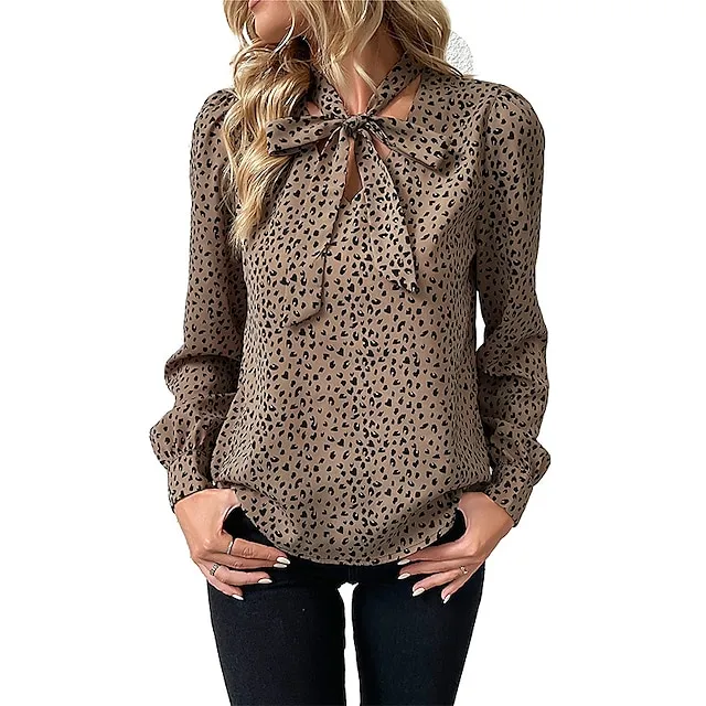 Shirt Blouse Women’s Khaki Leopard Print Lace up Printing Street Daily Fashion Daily V Neck Regular Fit S