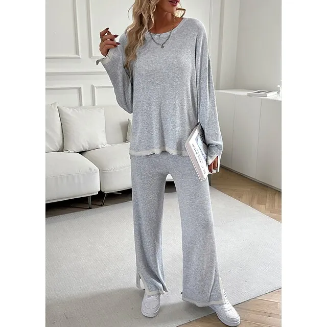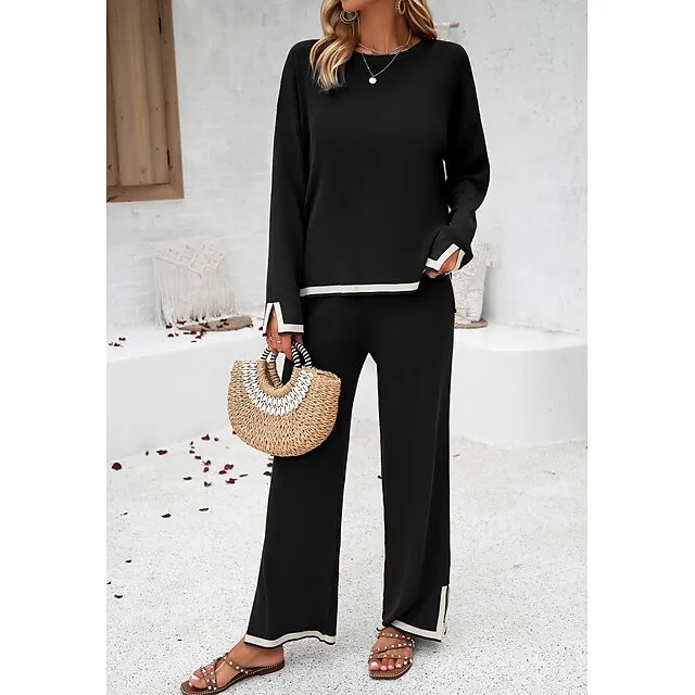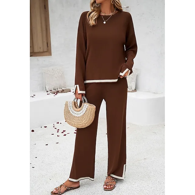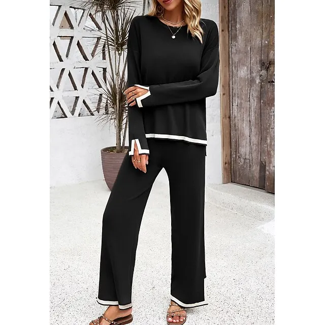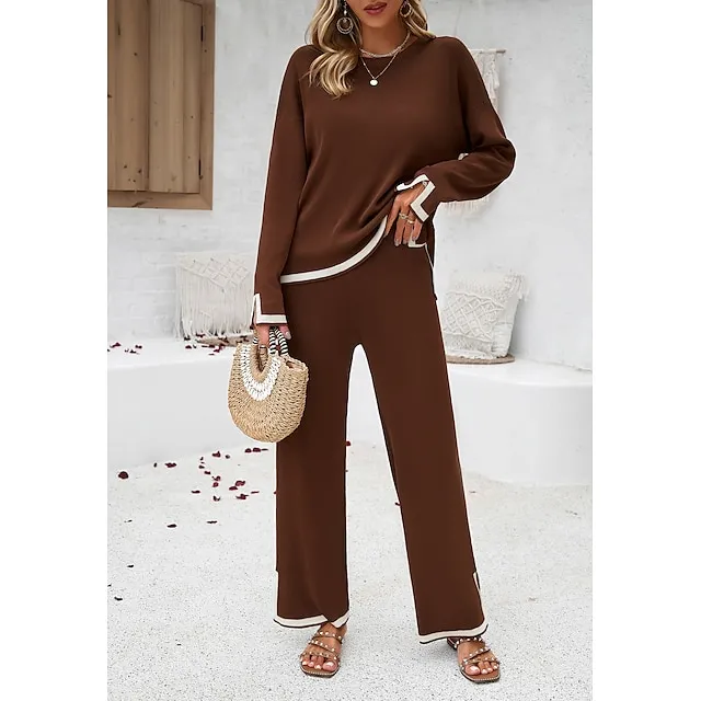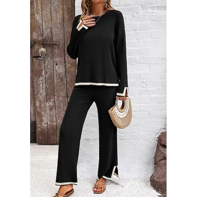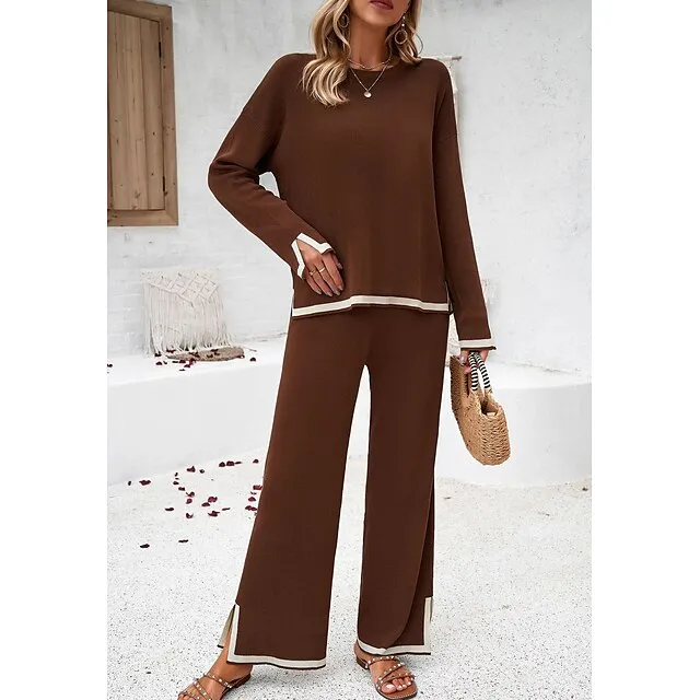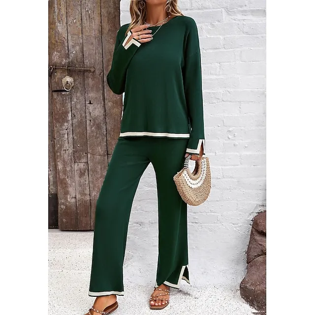 Shirt Pants Sets Women’s Black Brown Green Plain Split Casual Daily Fashion Round Neck Regular Fit S