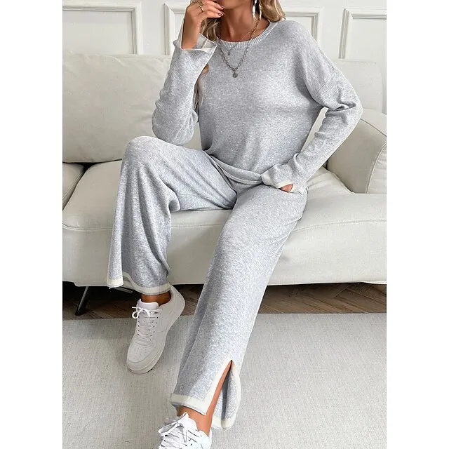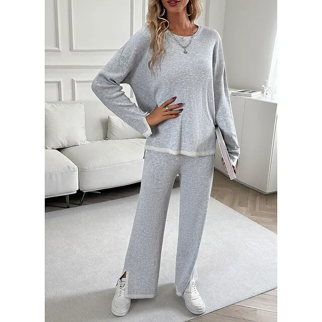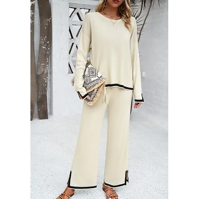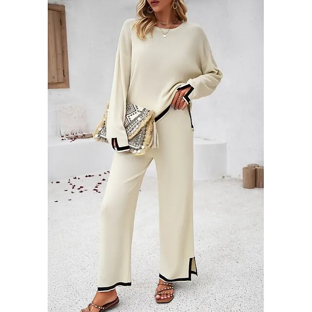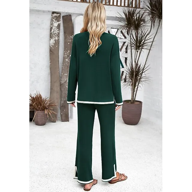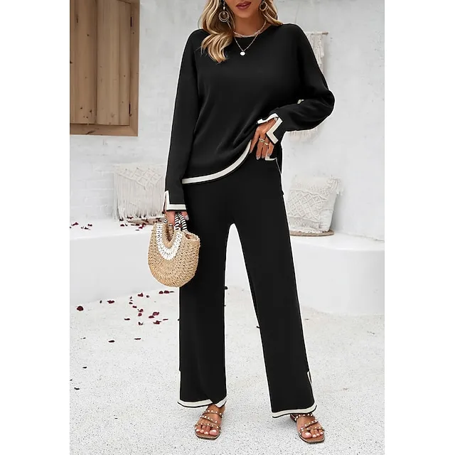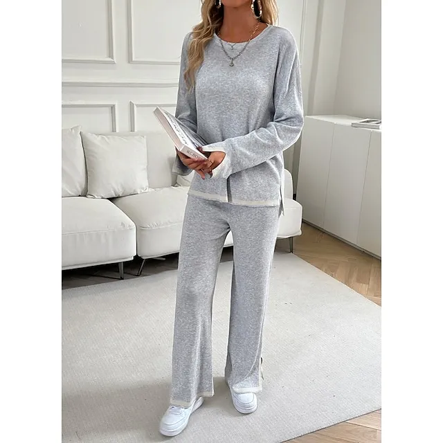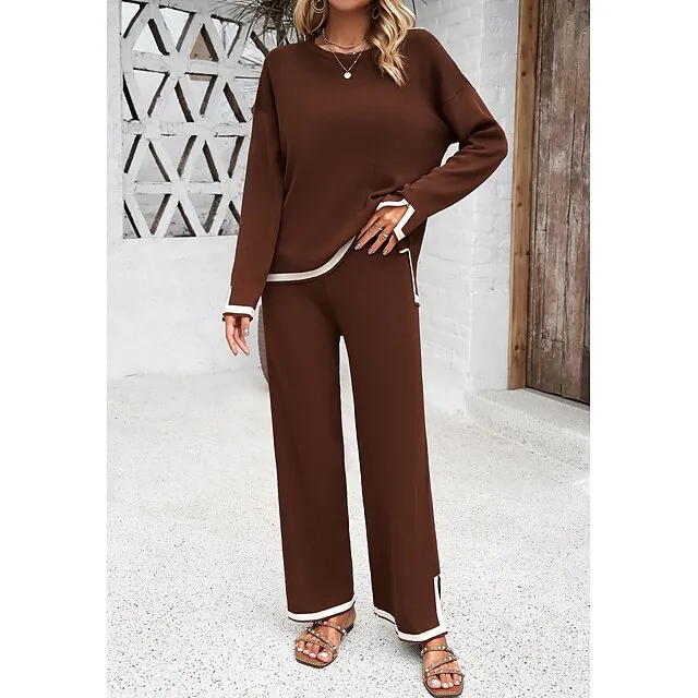 Shirt Pants Sets Women’s Black Brown Green Plain Split Casual Daily Fashion Round Neck Regular Fit S