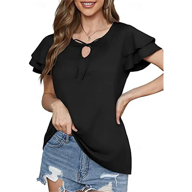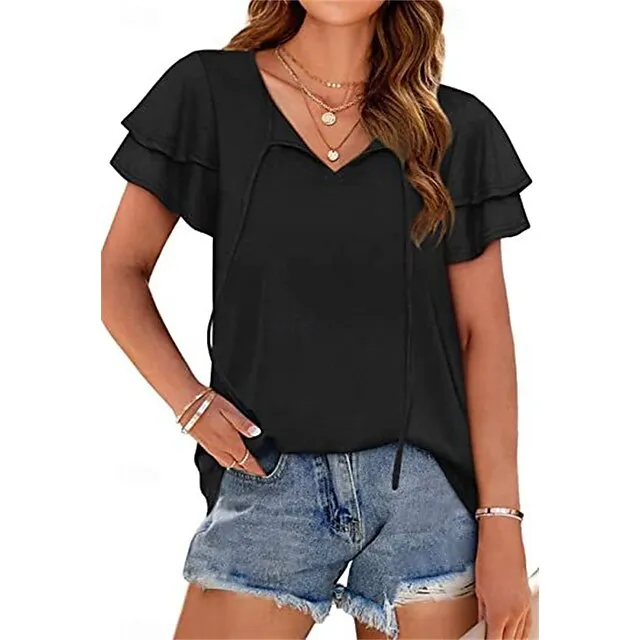 T shirt Tee Women’s Black Pink Blue Solid Color Lace up Ruffle Street Daily Fashion V Neck S