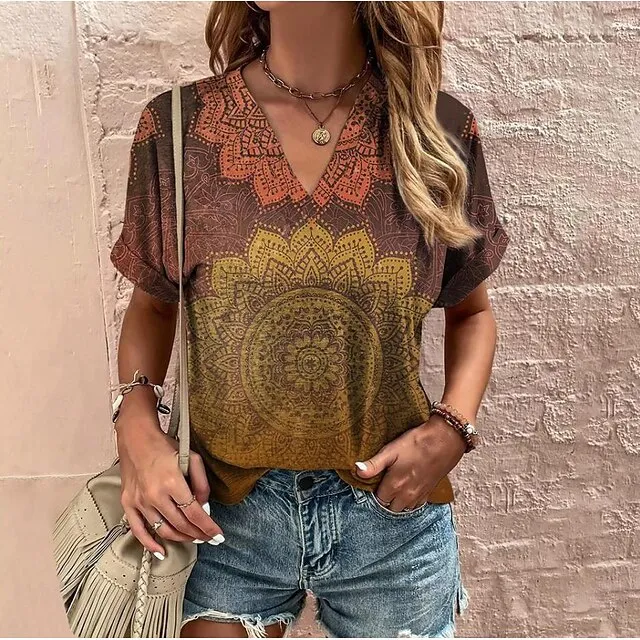 T shirt Tee Women’s Black+white+grey Yellow Red Geometic Stripes and Plaid Printing Geometrical Party Daily Fashion Daily Retro V Neck Regular Fit S