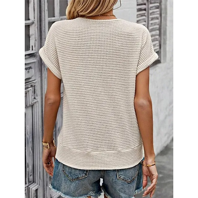 Women’s Blouse Waffle Plain Casual Going out Khaki Patchwork Short Sleeve Fashion Streetwear Round Neck Regular Fit Summer