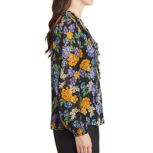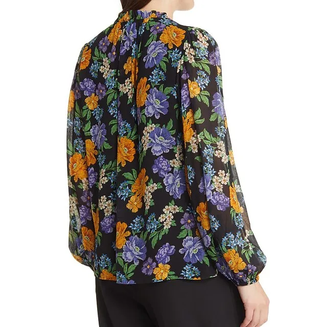 Women’s Floral Ruffle Balloon Sleeve Chiffon Shirt Blouse V Neck Blouse with Tassel Ties