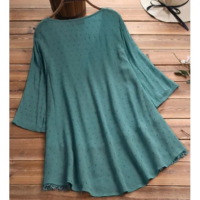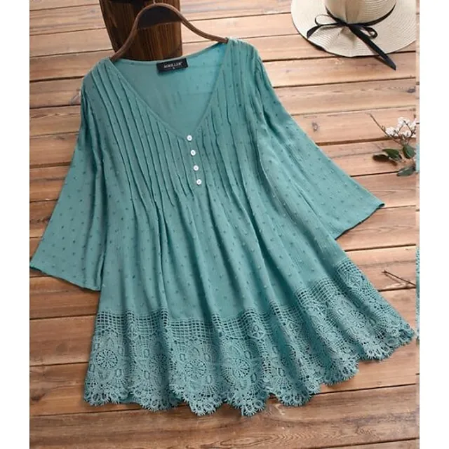 Women’s Lace Shirt Shirt Blouse White Eyelet Tops Cotton Pure Color Daily White Pink Green Lace Button 3/4 Length Sleeve Basic Casual V Neck Regular Fit Summer Spring Fall