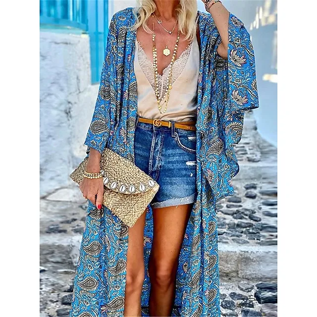 Women’s Shirt Blouse Floral Casual Holiday Red Blue Green Print Long Sleeve Boho Halter Neck Regular Fit Summer Spring