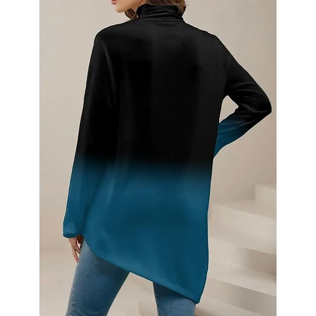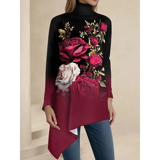 Women's T shirt Tee Floral Holiday Weekend Black Print Asymmetrical Long Sleeve Fashion Turtleneck High Neck Regular Fit Spring & Fall