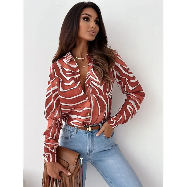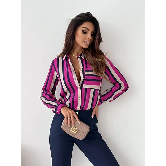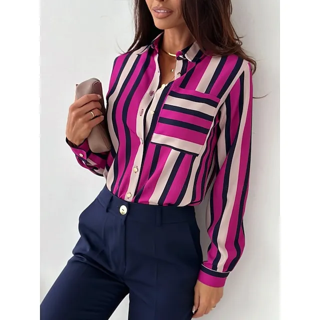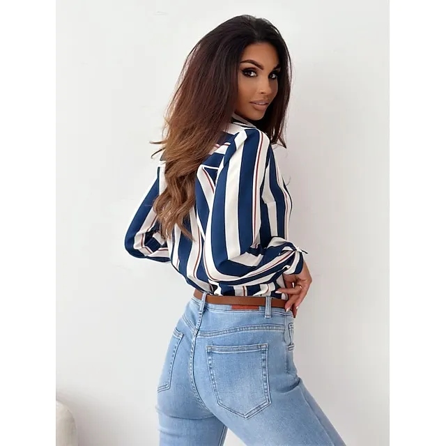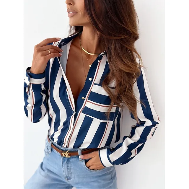 Women’s Shirt Blouse Graphic Striped Work Red Royal Blue Blue Print Button Pocket Long Sleeve Fashion Shirt Collar Regular Fit Spring & Fall