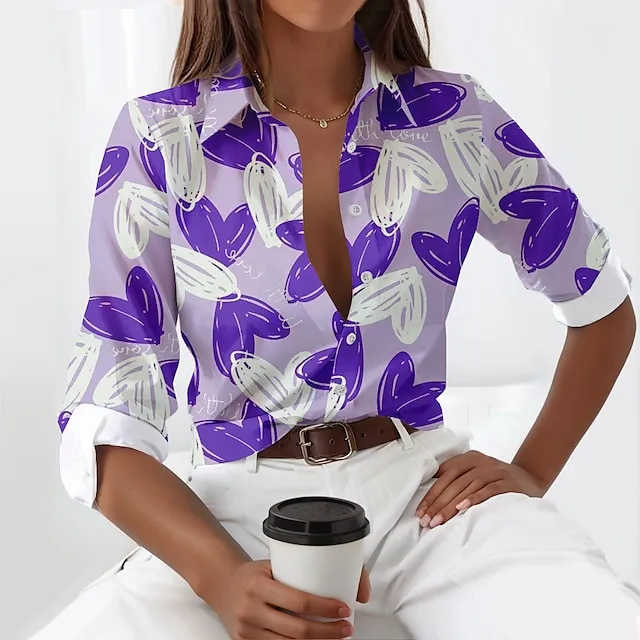 Women’s Shirt Blouse Heart Casual Going out Red Blue Purple Button Print Long Sleeve Fashion Shirt Collar Regular Fit Spring & Fall