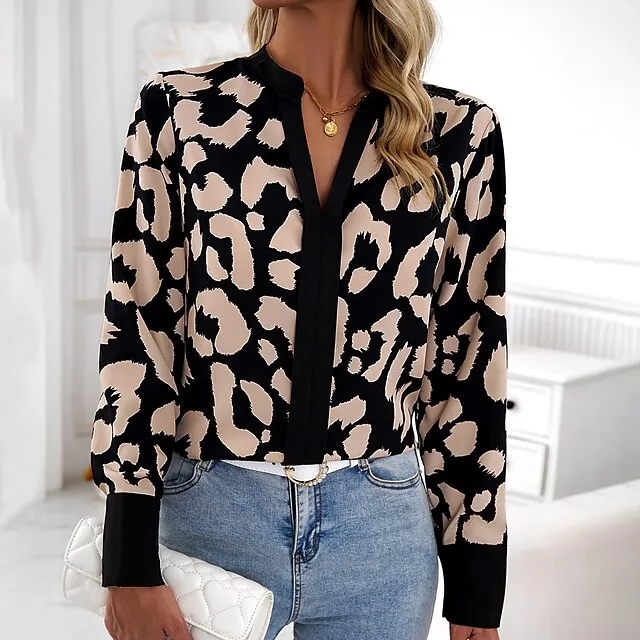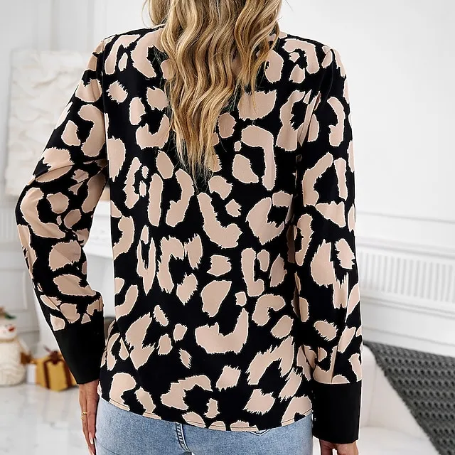 Women’s Shirt Blouse Leopard Work Black Print Long Sleeve Daily V Neck Regular Fit Spring & Fall