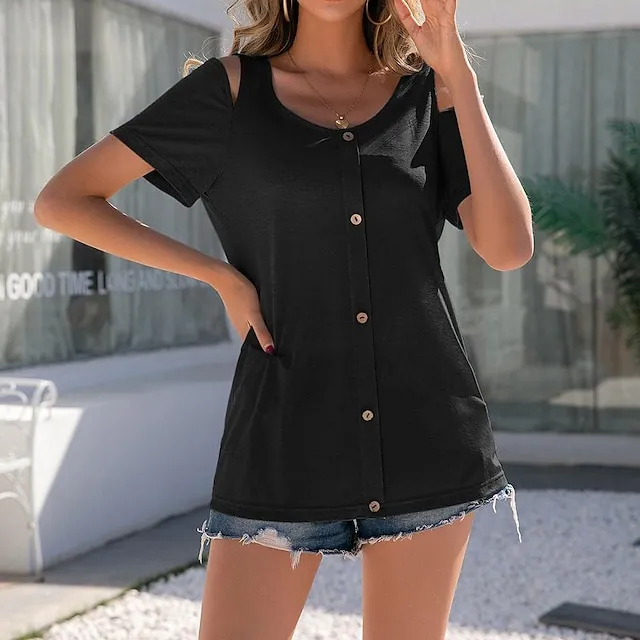 Women’s Shirt Blouse Plain Casual Cold Shoulder Black White Pink Button Cut Out Short Sleeve Fashion Round Neck Regular Fit Summer