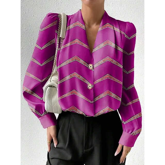 Women’s Shirt Blouse Striped Casual Light Green Pink Red Print Button Long Sleeve Fashion V Neck Regular Fit Spring & Fall