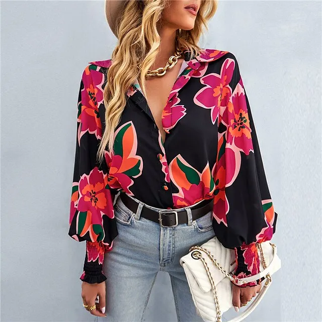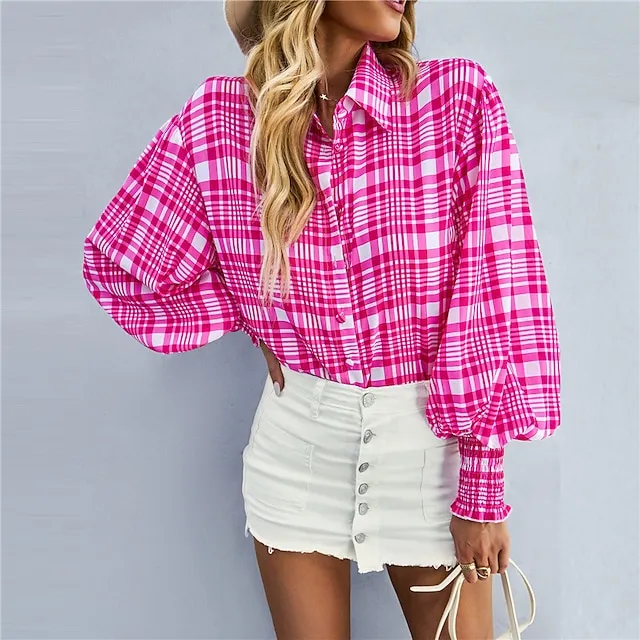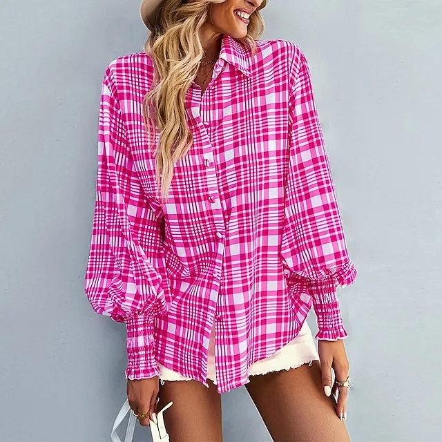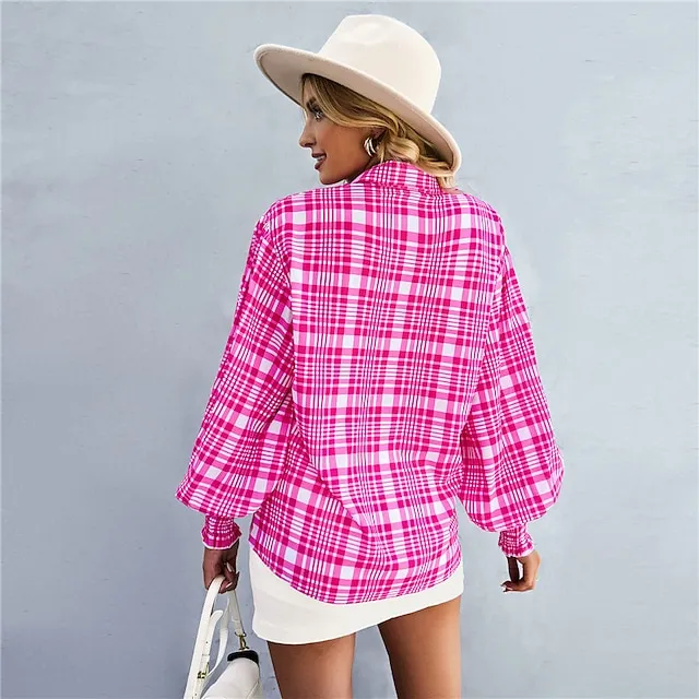 Women’s Shirt Lantern Sleeve Blouse Floral Plaid Casual Holiday Black Red Blue Print Button Long Sleeve Basic Shirt Collar Regular Fit Spring & Fall