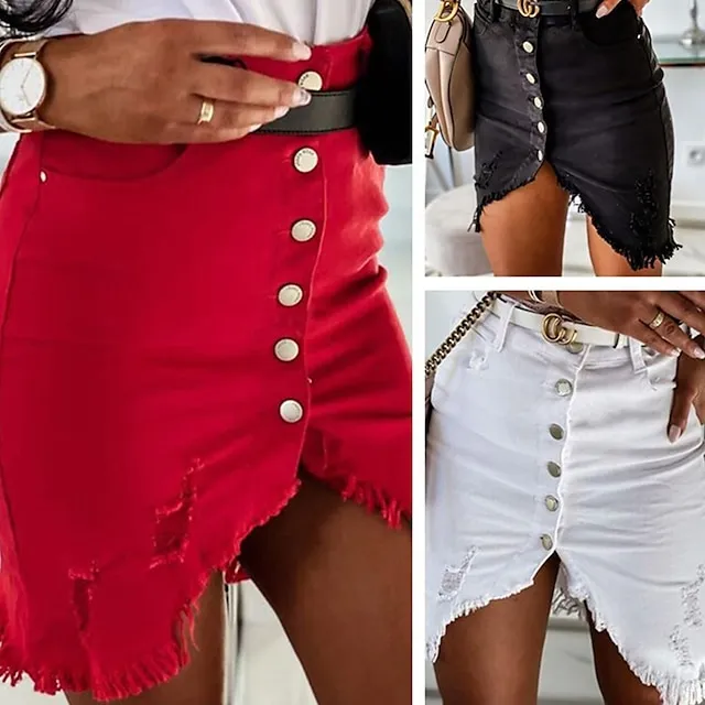 Women’s Skirt Bodycon Denim Mini Skirt Black White Red Skirts Fall & Winter Tassel Fringe Pocket Ripped Fashion Casual Street Date M L XL