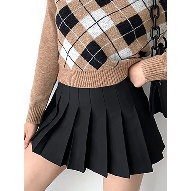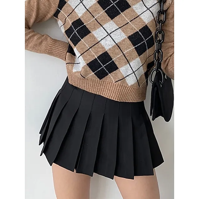– Cute design with pleats and a skater style, available in solid colors or plaid.
