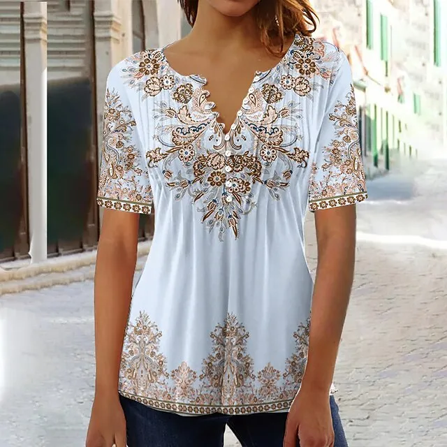 Women’s T shirt Tee Henley Shirt Floral Holiday Weekend White Yellow Blue Print Button Short Sleeve Elegant Fashion Tunic Round Neck Regular Fit