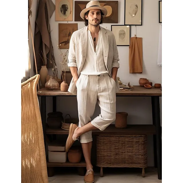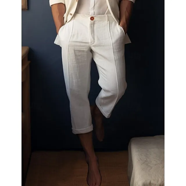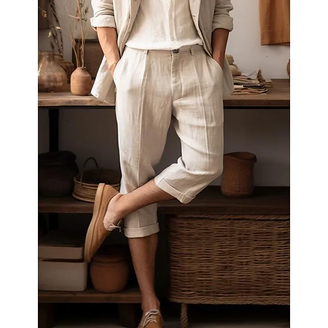 40% Linen Men’s Linen Shorts Summer Shorts Linen Capri Pants Button Up Pocket Plain Breathable Comfortable Calf-Length Daily Vacation Going out Classic Casual Black Navy Blue