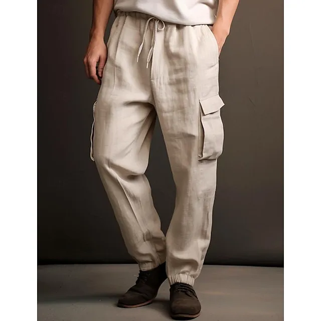 40% Linen Men’s Linen Pants Trousers Summer Pants Pocket Drawstring Elastic Waist Plain Breathable Comfortable Daily Vacation Going out Classic Casual Black White