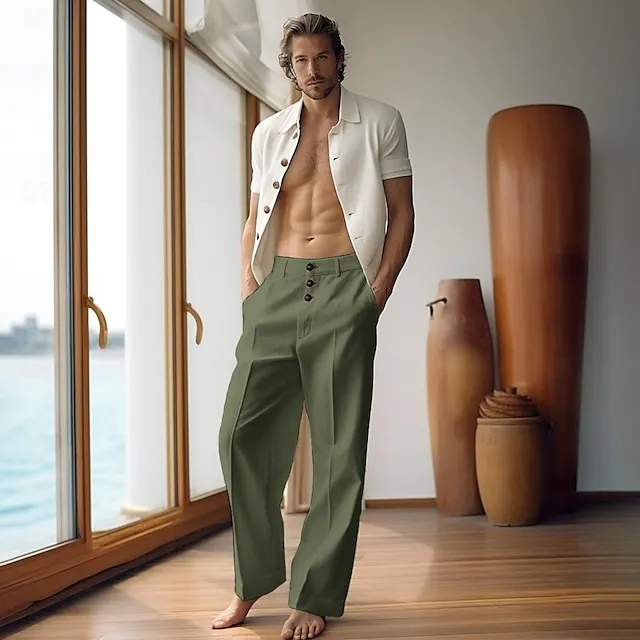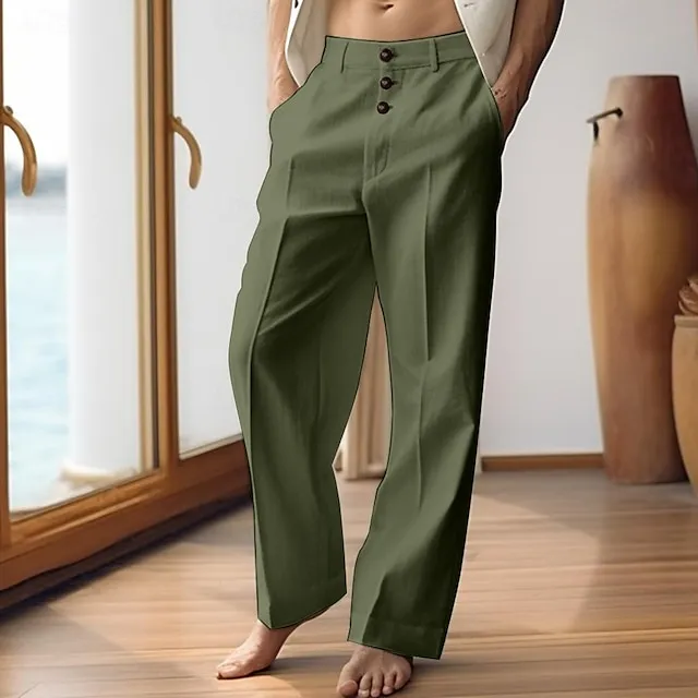 40% Linen Men’s Linen Pants Trousers Summer Pants Button Pocket Straight Leg Plain Breathable Comfortable Office / Career Daily Vacation Classic Casual Black White