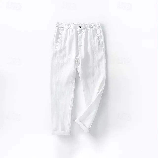 40% Linen Men’s Linen Pants Trousers Summer Pants Pocket Elastic Waist Straight Leg Plain Breathable Comfortable Office / Career Daily Vacation Classic Casual Black White